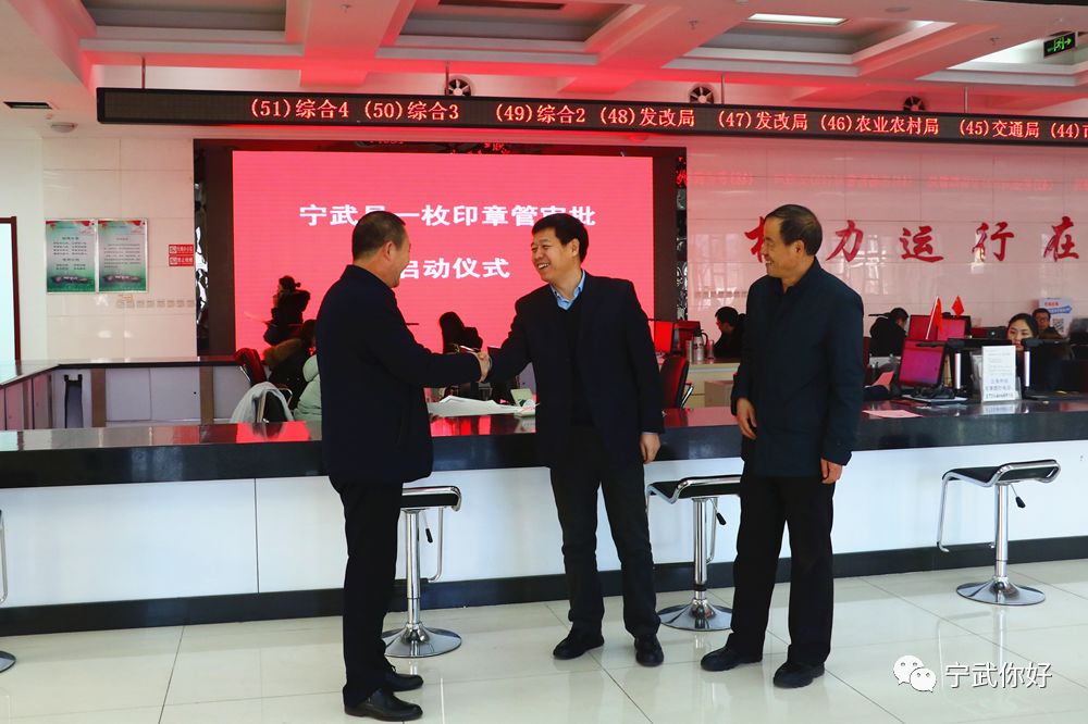 2019年12月31日,宁武县“一枚印章管审批” 正式启动运行,县长王卓颁发“一枚印章管审批”第一份营业执照,开启了由“多枚印章管审批”到“一枚印章管审批”的全新时代,标志着宁武县推进相对集中行政许可权改革、加快政府职能转变迈出了实质性步伐。