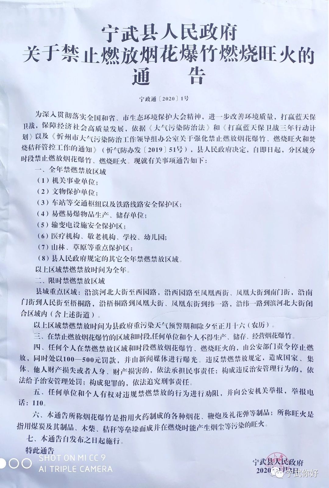 宁武县人民政府关于禁止燃放烟花爆竹燃烧旺火的通告