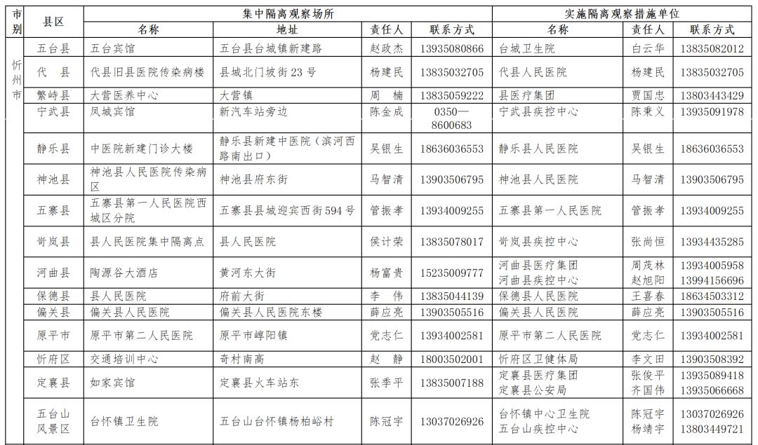 为进一步做好武汉来晋返晋人员的隔离观察,我省以县(市、区)为单位设立了125个集中隔离点,为不具备家庭隔离条件或外地流动人员提供集中隔离便利,现将各县(市、区)设立的集中隔离点相关信息通告如下: