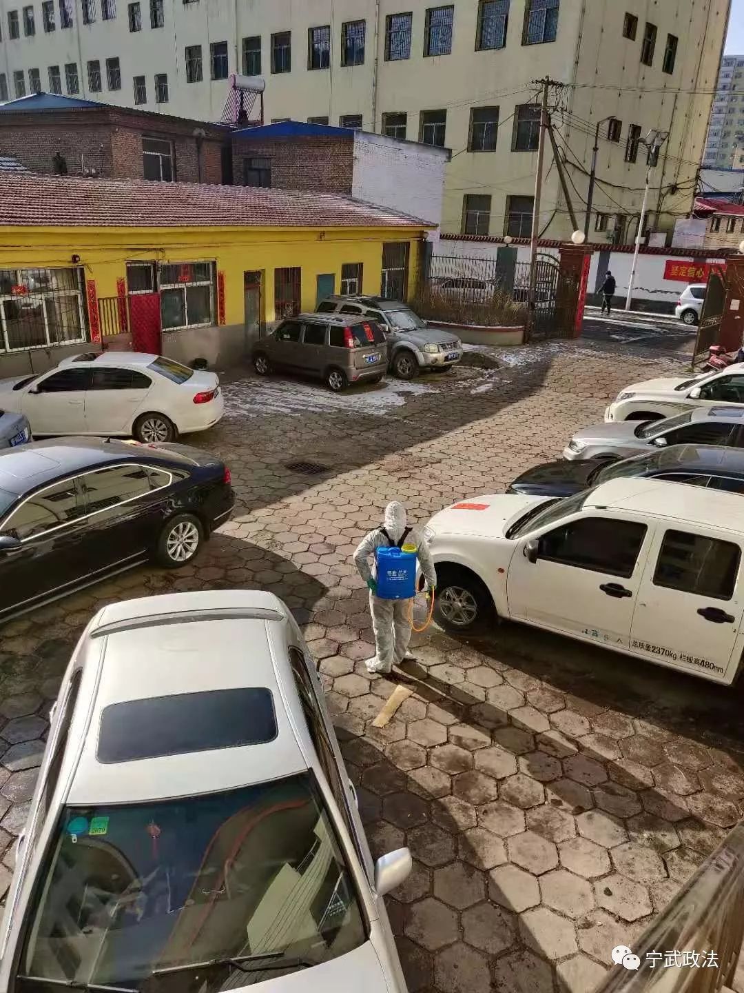 鼓楼社区网格长在农业农村局内进行消毒