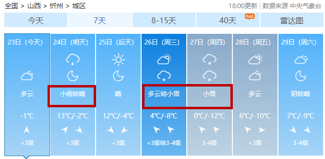 24日白天到夜间:阴转晴,白天大部小雨,西南风转西北风2-3级,局部地区3-4级,忻府区温度-1~9℃;