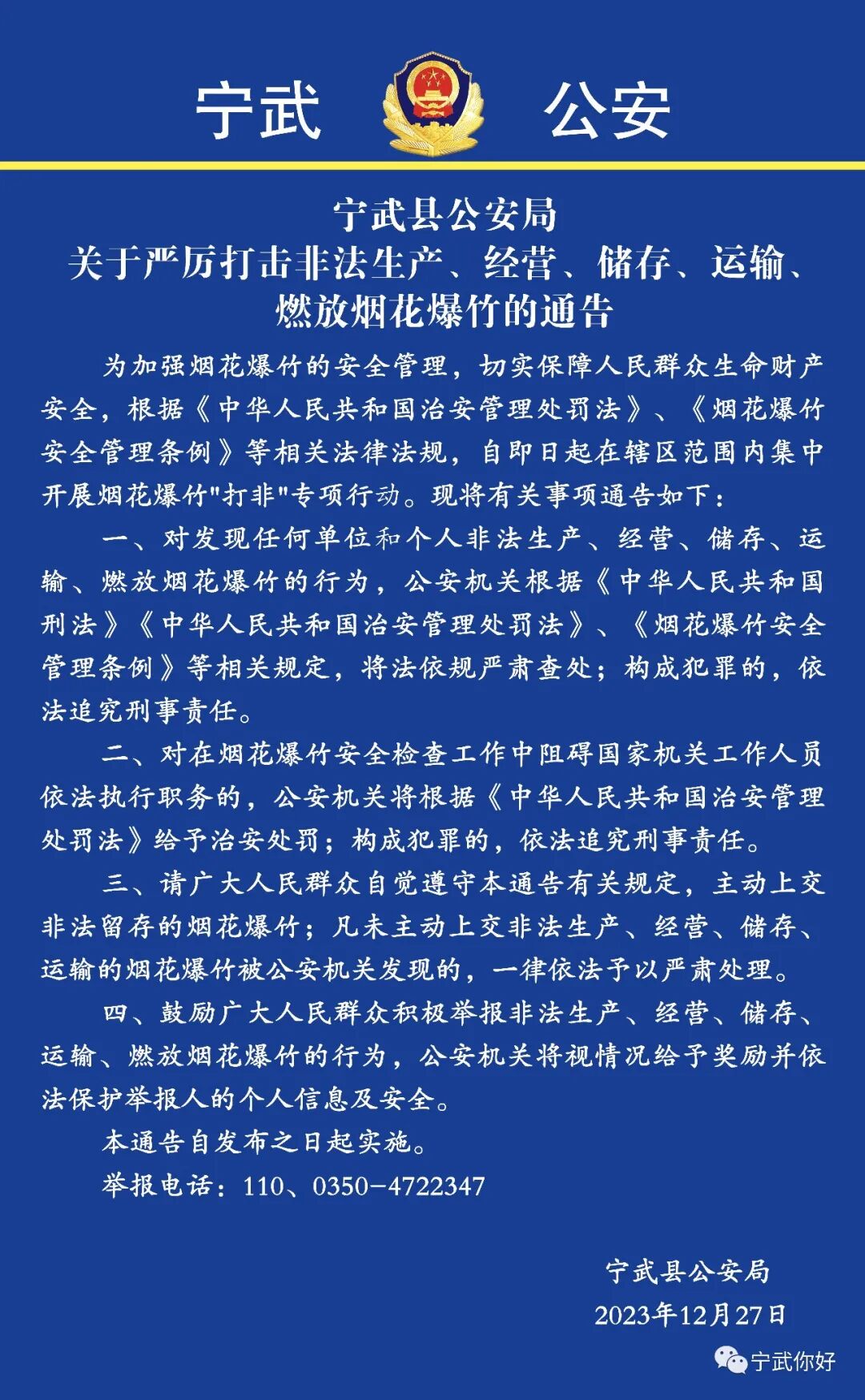 宁武县关于严厉打击非法生产、经营、储存、运输、燃放烟花爆竹的通告