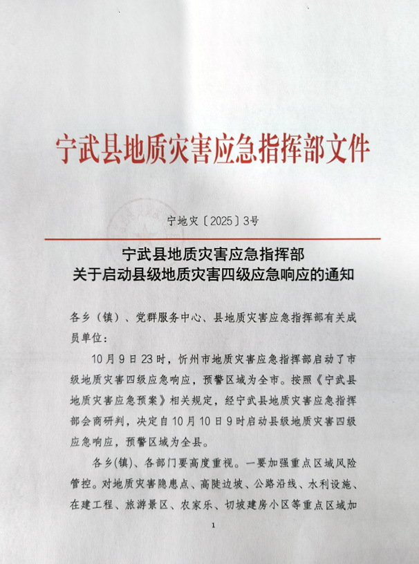 宁武县关于启动县级地质灾害四级应急响应的通知