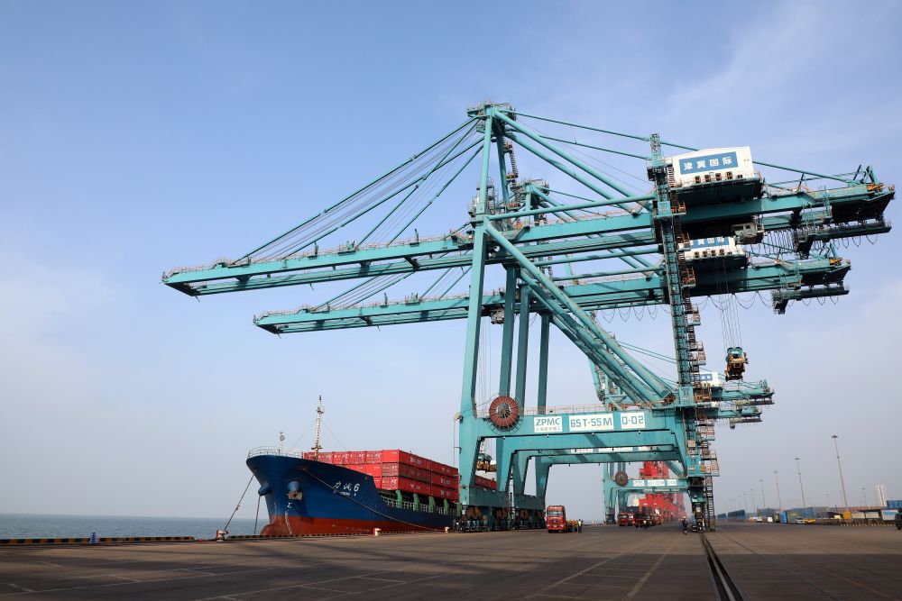3月9日,船舶停靠在黄骅港综合港区集装箱码头进行卸船作业。新华社记者 骆学峰 摄