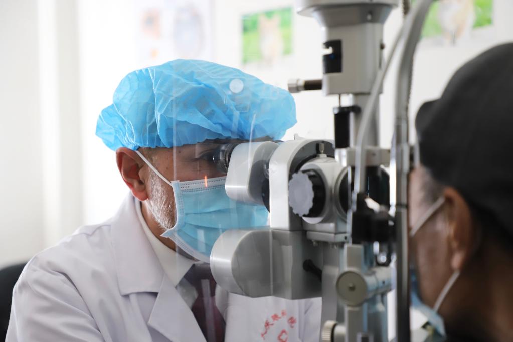 卡培拉别科夫为患者检查双眼(2020年4月11日摄)。新华社记者 徐凯鑫 摄