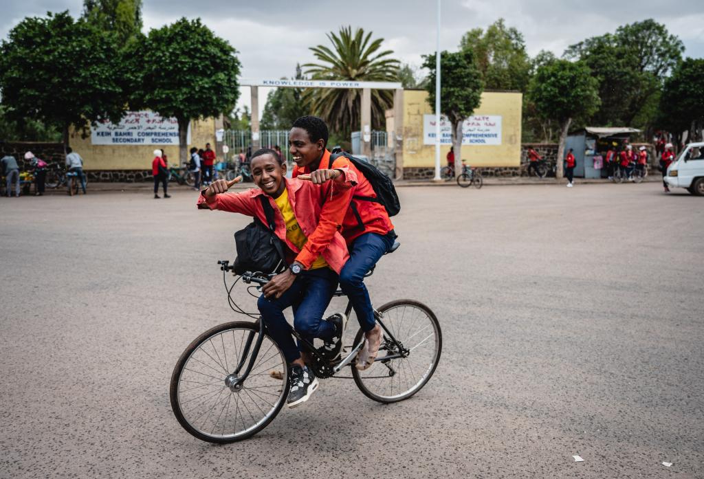 人们在厄立特里亚首都阿斯马拉街头骑行。