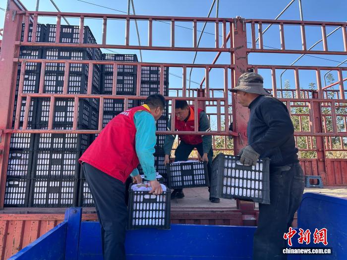 在苹果种植园,服务队队员小心将苹果摘下,按照大小、色泽分拣装筐,再合力搬到运输车上,整个过程高效快速。过去一周,他们共协助13户农户完成采摘装运,累计助力外销苹果1000多筐。