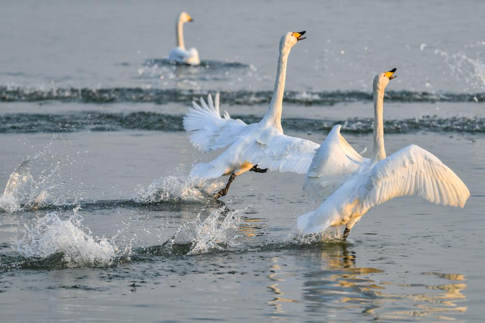 占地6000多公顷的山西平陆黄河湿地位于山西、河南两省交界处,这里气候温和、采食丰富,是我国大天鹅越冬的重要栖息地之一。近年来,随着平陆黄河湿地生态环境不断改善,每年到此越冬的大天鹅数量在1万只左右。