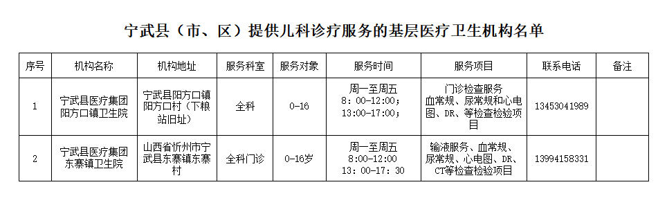 宁武县提供儿科诊疗服务的基层医疗卫生机构名单