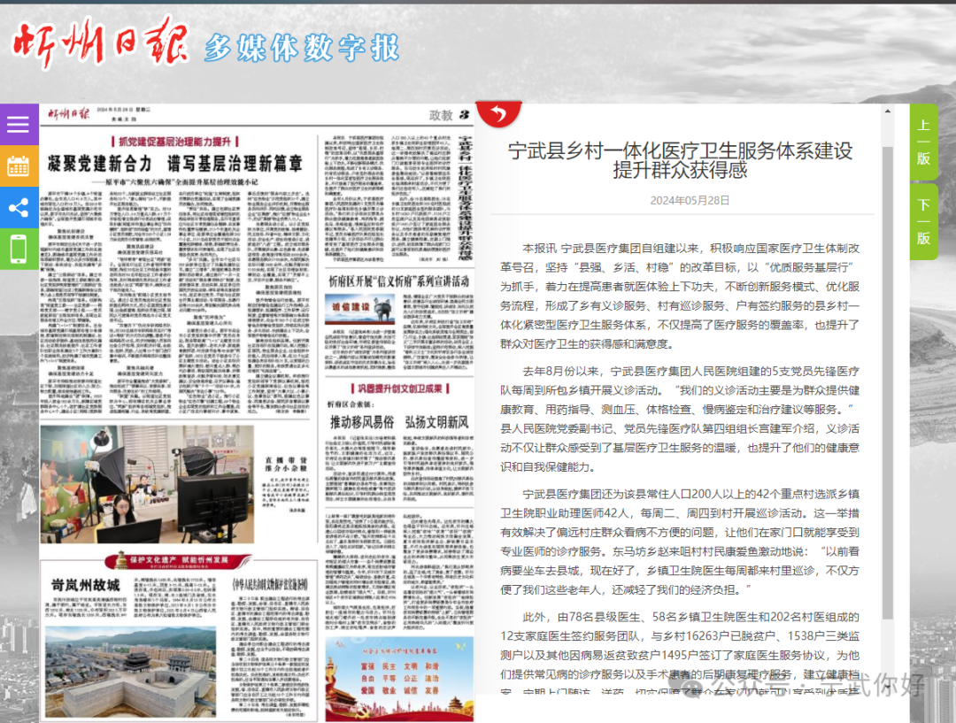 《忻州日报》讯 宁武县医疗集团自组建以来,积极响应国家医疗卫生体制改革号召,坚持“县强、乡活、村稳”的改革目标,以“优质服务基层行”为抓手,着力在提高患者就医体验上下功夫,不断创新服务模式、优化服务流程,形成了乡有义诊服务、村有巡诊服务、户有签约服务的县乡村一体化紧密型医疗卫生服务体系,不仅提高了医疗服务的覆盖率,也提升了群众对医疗卫生的获得感和满意度。