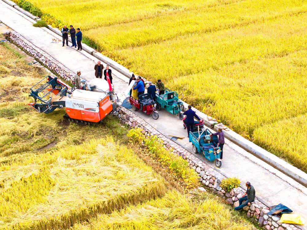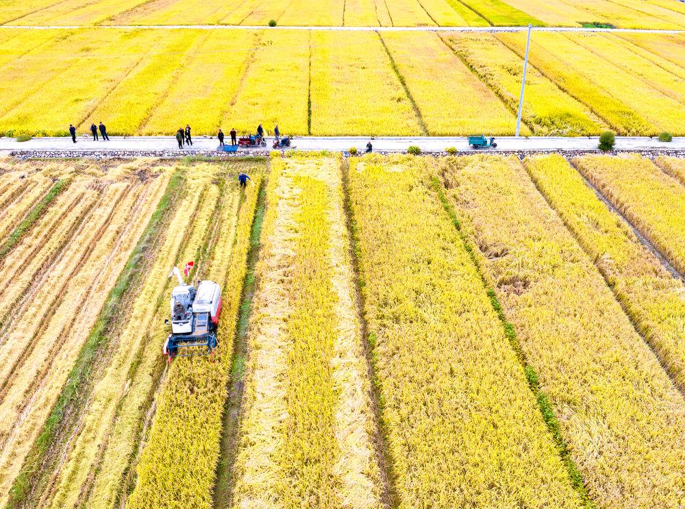 今年,当地雨水充沛,光照充足,水稻长势喜人。沉甸甸的稻穗压弯了稻秆,预计亩产将再创新高。这片金色的丰收画卷,不仅展现了现代农业的高效作业,更见证了农民们辛勤劳作的硕果,为这个秋天增添了最动人的色彩。(张文军)