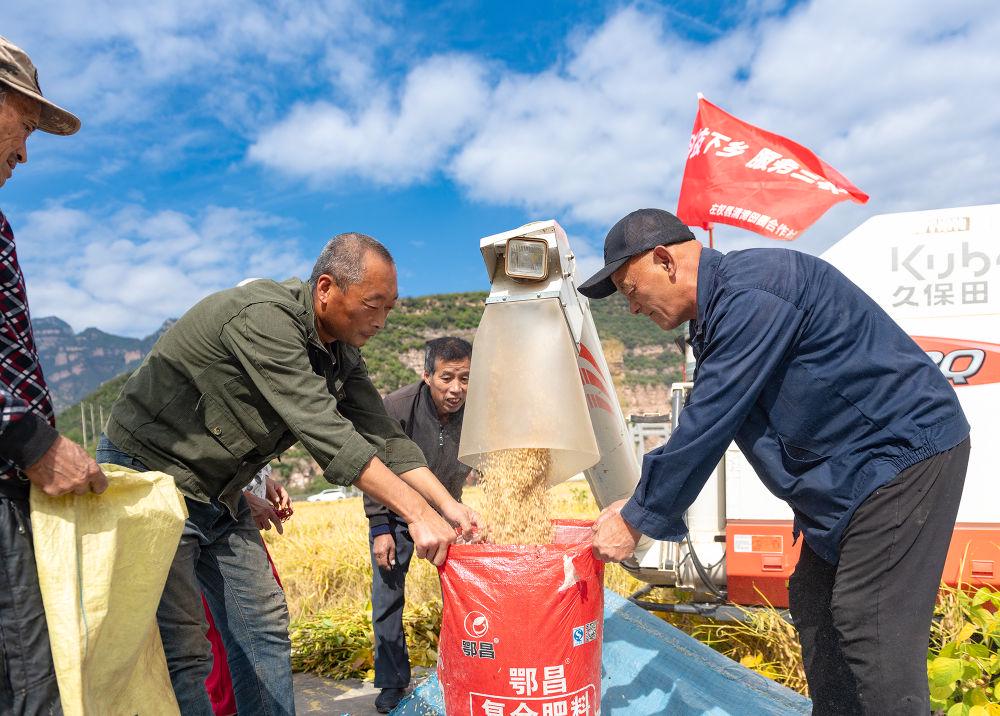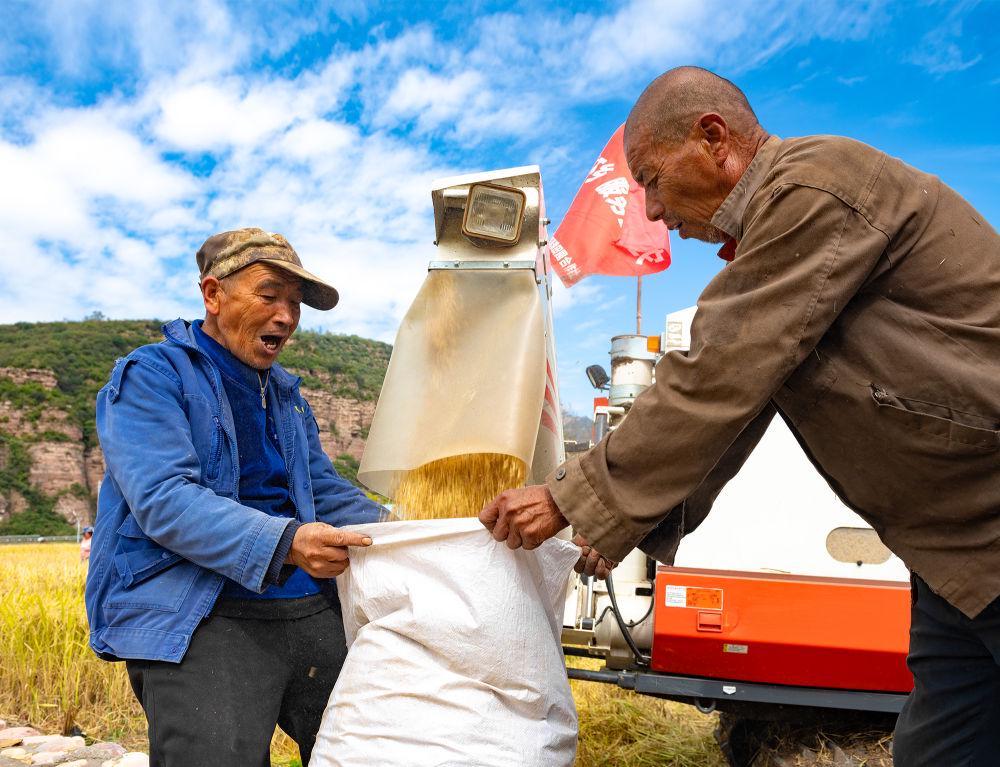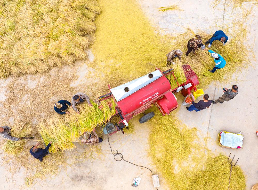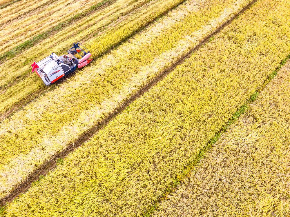 田间地头,一派繁忙景象。大型收割机在成片的稻浪中轰鸣穿梭,高效完成收割、脱粒等工序;对于部分因大风倒伏的水稻,村民们则弯腰进行人工抢收。与此同时,打谷、装袋、运输……各项工序有条不紊,机械与人力紧密配合,勾勒出一幅生动的秋收画卷。