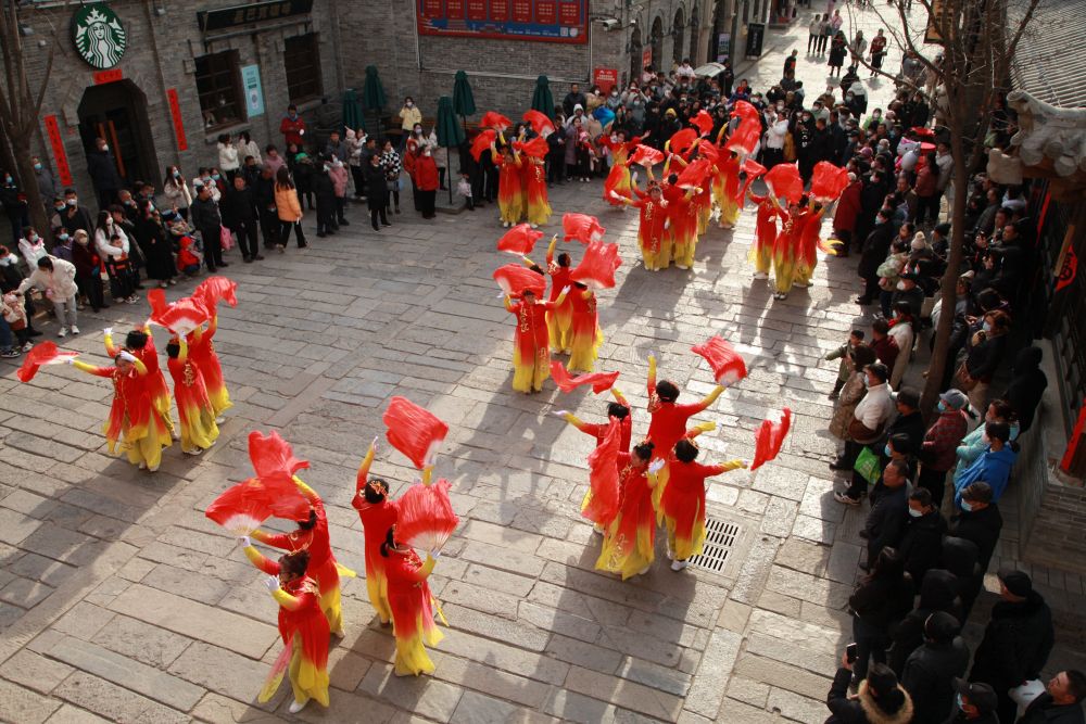 山西省忻州市忻州古城春节期间为游客举行传统秧歌展演。 (2024年2月6日摄) 郭耀华摄