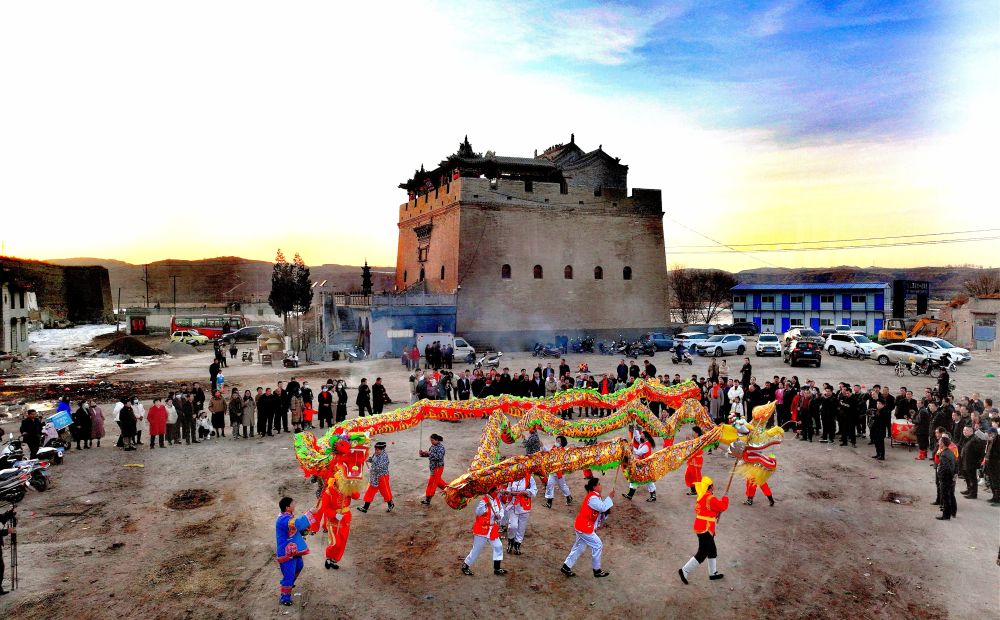 山西省忻州市河曲县在黄河岸畔的古城堡下举办双龙舞民俗展演 (2024年2月20日摄) 张玉明摄