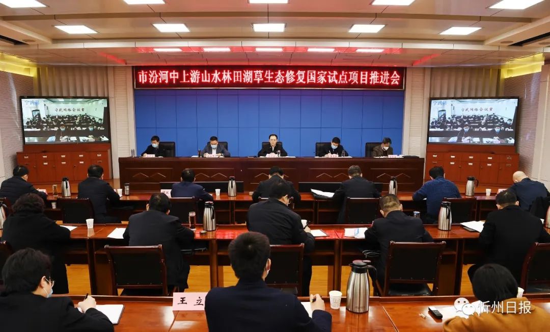 2月26日,我市召开汾河中上游山水林田湖草综合治理国家试点项目推进会,研究项目推进的具体事项,对迅速启动今年实施项目,确保年度任务顺利完成进行安排部署。省人大常委会副主任、市委书记李俊明出席会议并讲话。市委常委、秘书长崔建新出席。市委常委、常务副市长赵新年主持会议。会议以视频方式召开,设宁武、静乐分会场,市领导李德新在静乐分会场参加会议。市直相关部门主要负责同志,市汾河中上游山水林田湖草生态保护修复工程试点领导小组办公室、生态保护中心负责同志等在市主会场参加会议。