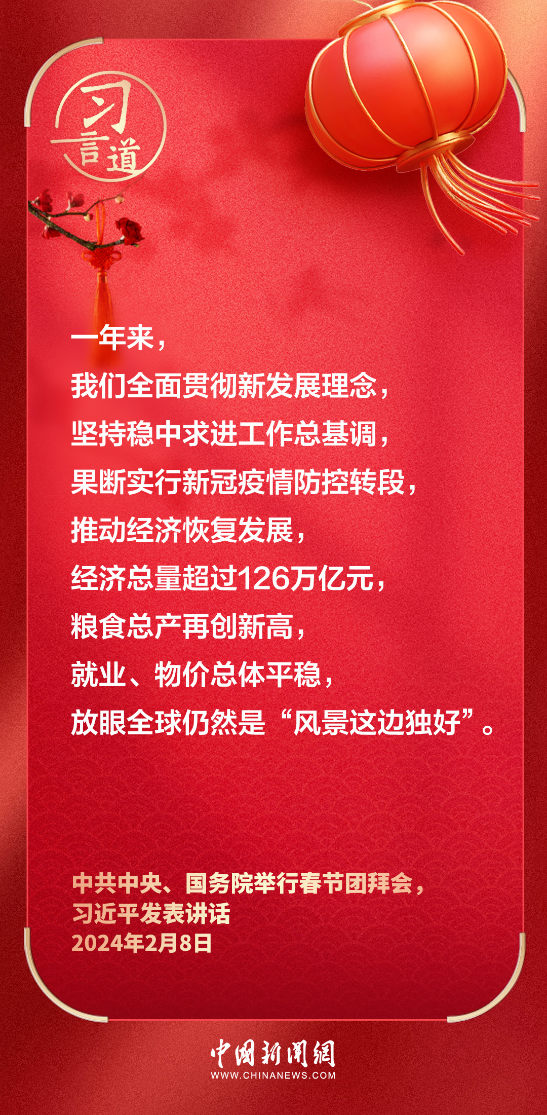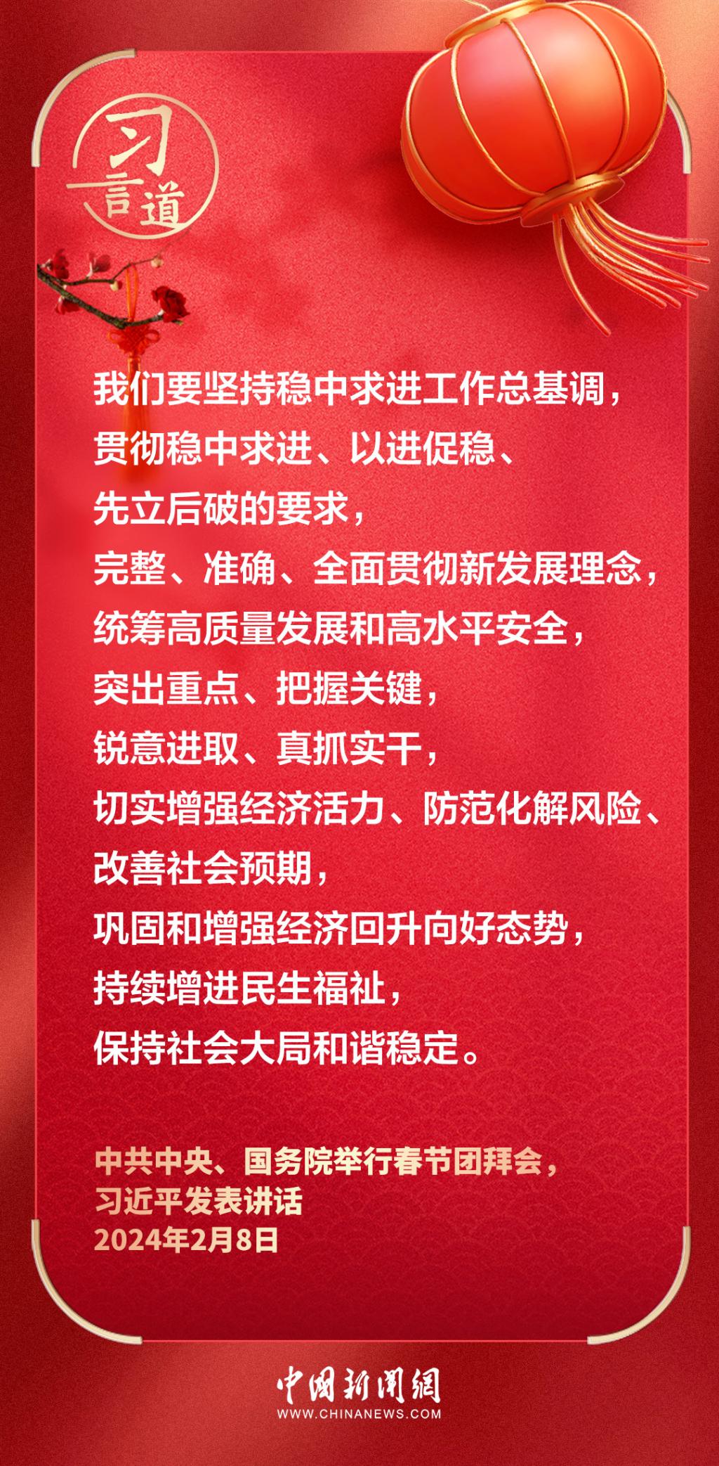 中共中央、国务院8日上午在人民大会堂举行2024年春节团拜会。中共中央总书记、国家主席、中央军委主席习近平发表讲话——