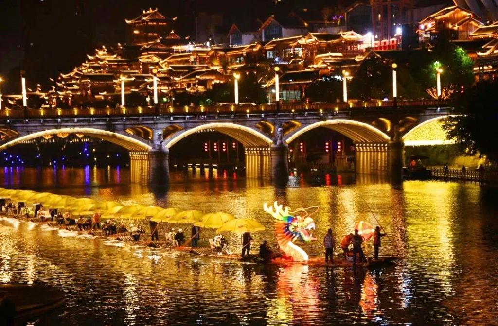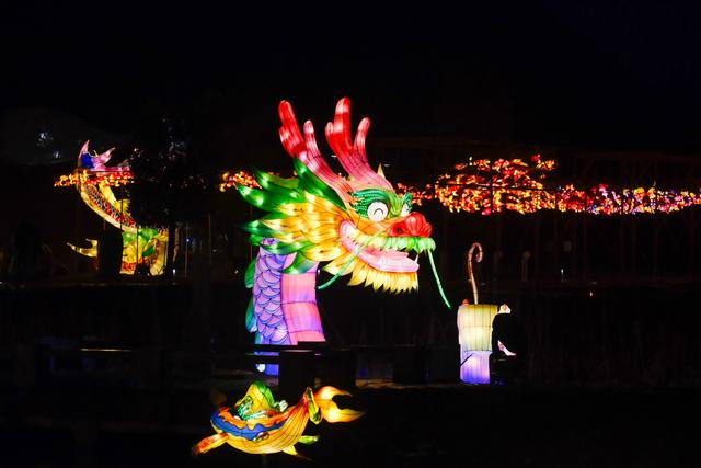 同样迎来2024年龙年新春灯会的,还有湖北省恩施州宣恩县城,这里的龙造型灯组格外亮眼,特别是其中一条非常壮观的“贡水游龙”,龙身由30多只竹筏串联而成,总长度达到200多米。游客还可以登上龙船观灯展、赏夜色。随着金色的巨龙在碧水中蜿蜒游动,也传递着吉祥的寓意。