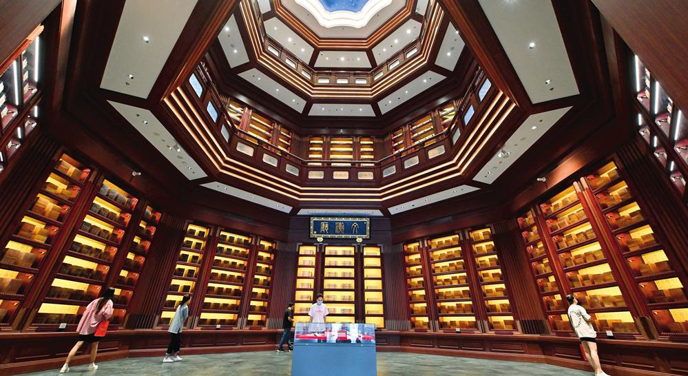 观众在位于北京的中国国家版本馆中央总馆文瀚厅内参观(2022 年 7 月 30 日摄)李鑫摄 / 本刊
