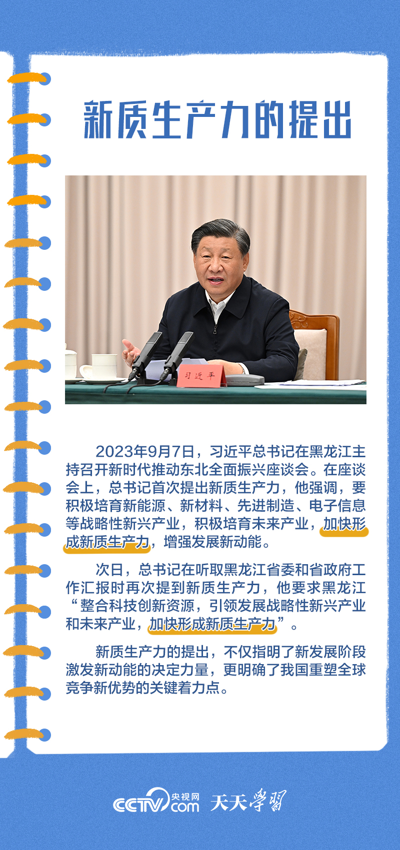 天天学习 2023年9月,习近平总书记在黑龙江考察调研时首次提出新质生产力。此后,新质生产力被正式写入中央文件。在今年1月中央政治局集体学习时,总书记对其作出了系统全面阐释,这一原创性概念成为国内外高度关注的中国推进高质量发展的重要着力点。