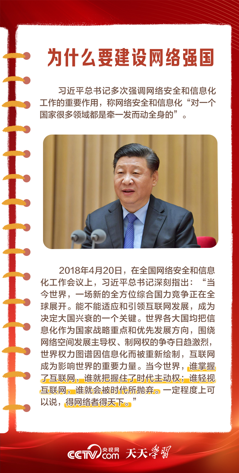 天天学习 党的十八大以来,习近平总书记高度重视网络强国建设,在网络强国建设实践基础上,提出了一系列新思想、新观点、新论断,形成了关于网络强国的重要思想。在这一重要思想引领下,我国互联网发展进入全新时代,网络强国蓝图徐徐铺展。