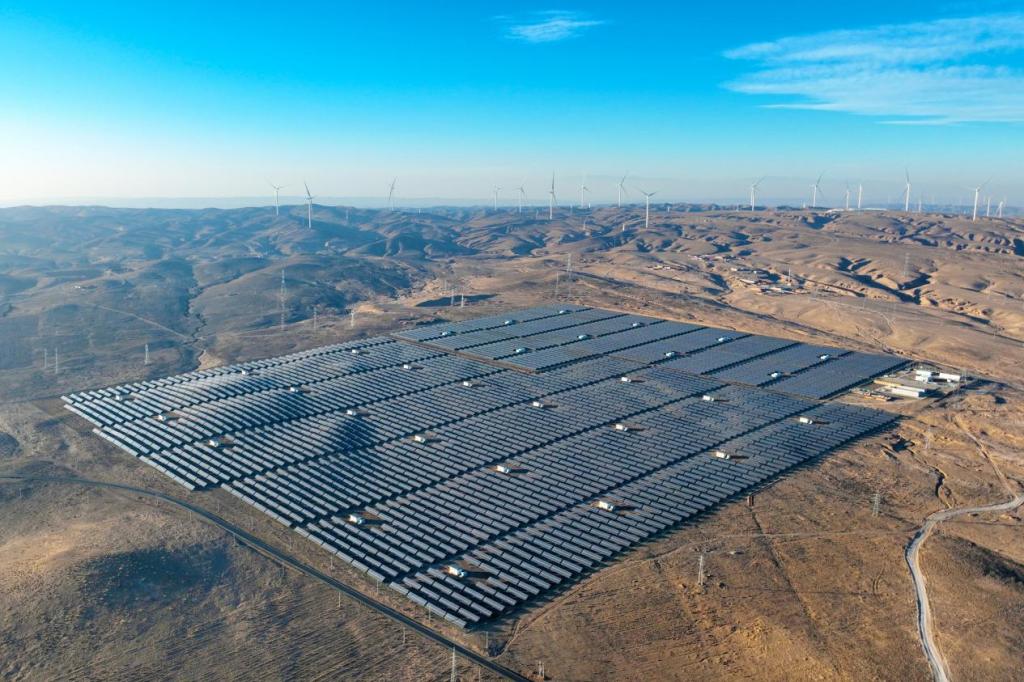 △ 2024年1月3日,宁夏银川,俯瞰灵武市境内的“沙戈荒”光伏基地,一块块蓝色光伏板源源不断地输送着绿色电能。