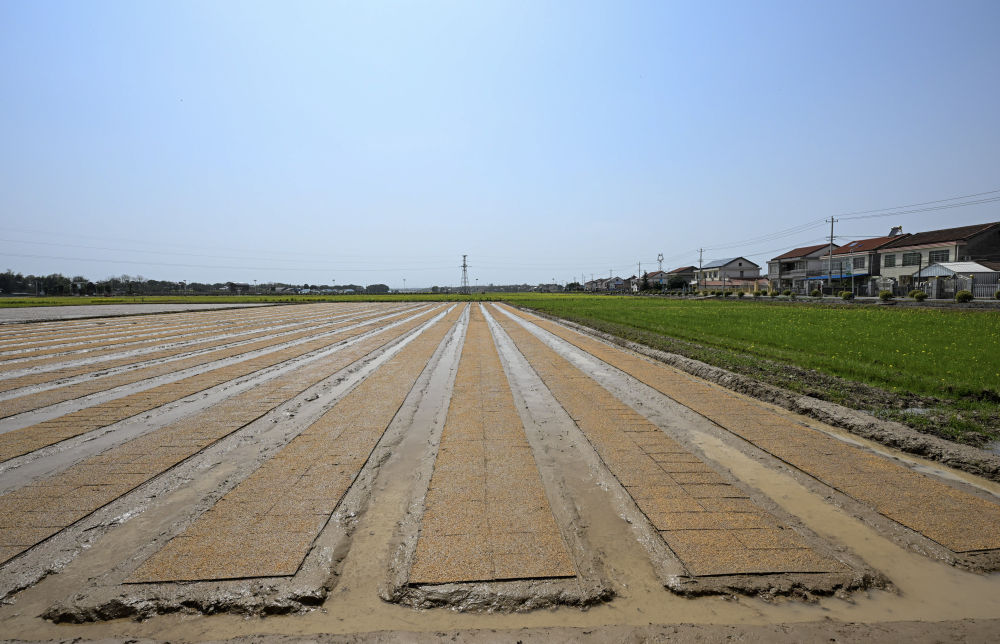 在道路另一侧的秧田,装满稻种的秧盘已经铺在一垄垄“秧床”上。为了保障秧苗后期的茁壮成长,过几天,农民还会用地膜为它们搭建好“房子”。