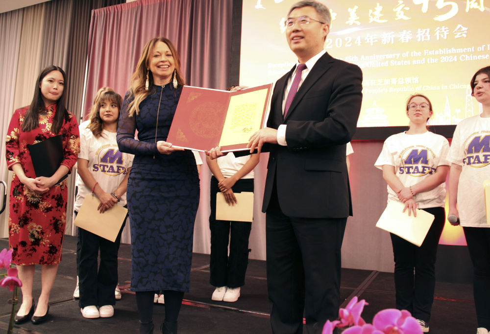 2024年2月27日,中国驻芝加哥总领事馆举办庆祝中美建交45周年招待会,来自马斯卡廷中学的学生们在招待会上收到一份特殊礼物——中国国家主席习近平给他们的复信。新华社记者 徐静 摄