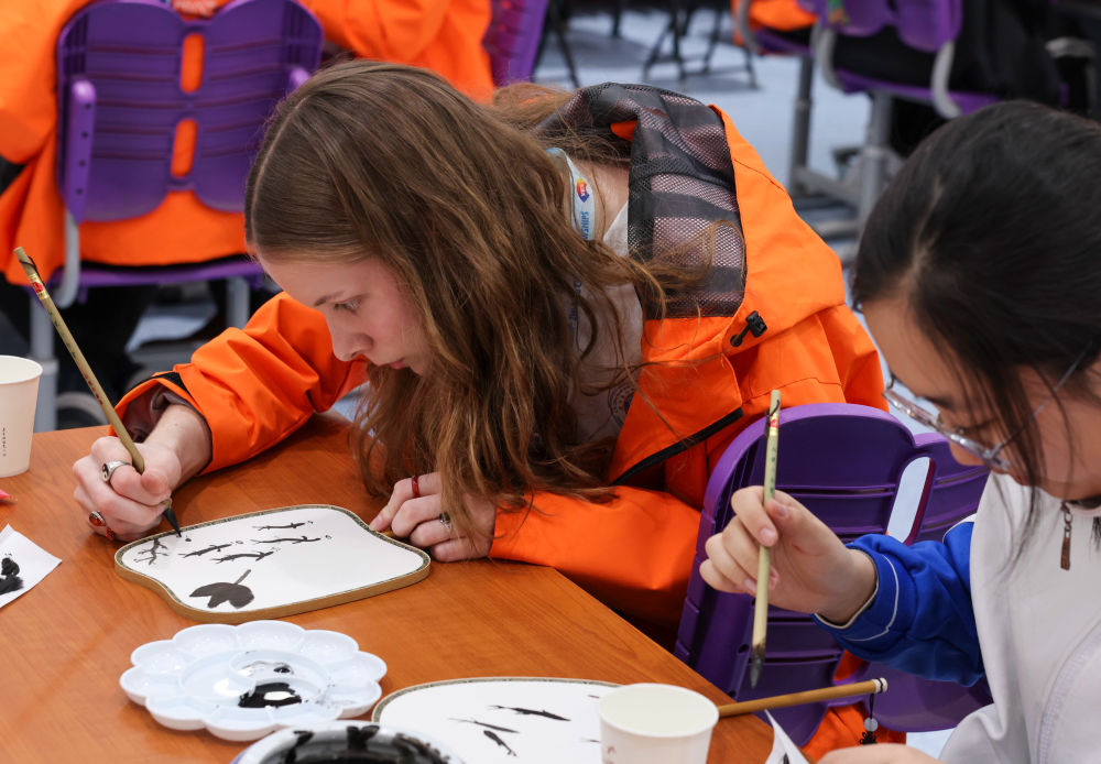 3月18日,在清华大学附属中学,美国华盛顿州中学生代表团的成员与中国中学生一起体验水墨画扇面绘制。新华社记者 殷刚 摄