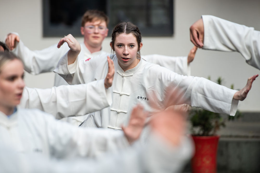 3月22日,美国华盛顿州中学生代表团成员在武当山体验太极武术。