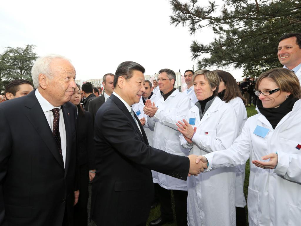 △2014年3月26日,习近平主席在法国里昂参观梅里埃生物科研中心,与科研中心员工握手。