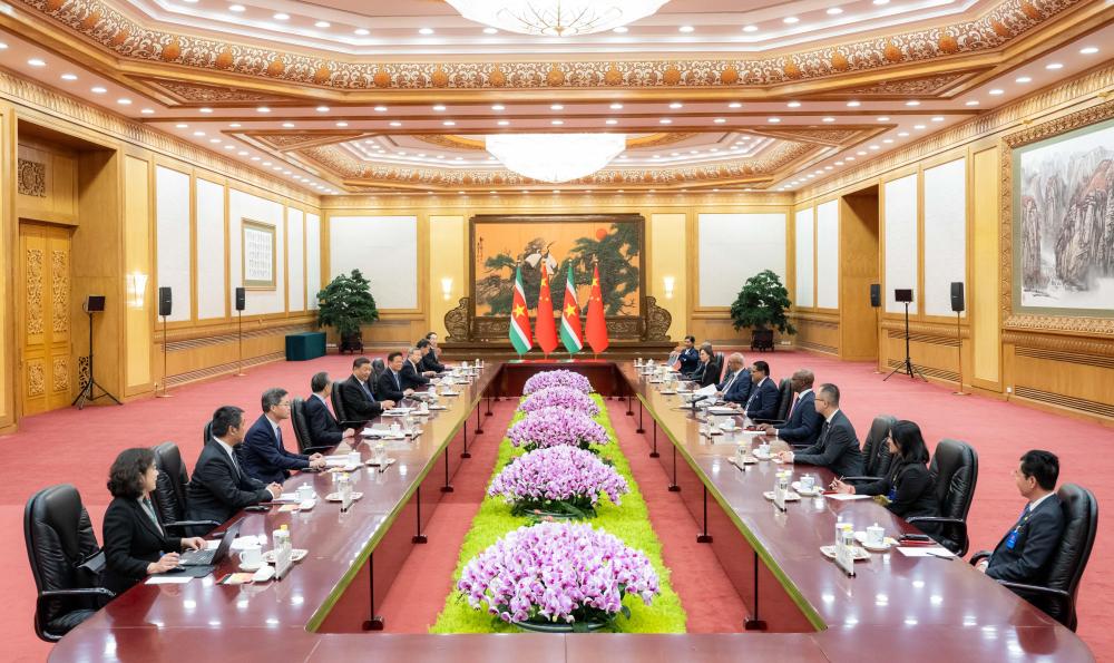 习近平强调,中方高度赞赏苏方始终坚定对华友好,在涉及中国核心利益和重大关切问题上坚定支持中方。中方也坚定支持苏方维护国家主权独立、自主选择符合本国国情的发展道路。中方愿同苏方继续相互理解、相互支持,保持高层交往,密切各部门、立法机构、政党间友好交往,加强治国理政经验交流。中方欢迎更多苏里南优质特色产品进入中国市场,愿同苏方深化共建“一带一路”合作,加强发展战略对接,拓展贸易、投资、农业、能源、矿业、基础设施建设、数字经济等领域合作,给两国人民带来更多实实在在的福祉。苏里南是加勒比地区华侨华人最多的国家之一,也是西半球首个把中国春节作为法定假日的国家。双方要继续鼓励人文交流,便利人员往来,共同建设好孔子学院。加强地方合作,不断丰富两国交流合作内涵。中方愿同苏里南等发展中国家一道,加强多边协调和团结合作,维护共同利益,实现共同发展,推动构建人类命运共同体。中方重视发展同加勒比国家关系,支持加勒比国家谋求繁荣发展、增进民众福祉,愿继续为地区国家经济社会发展提供力所能及的帮助。