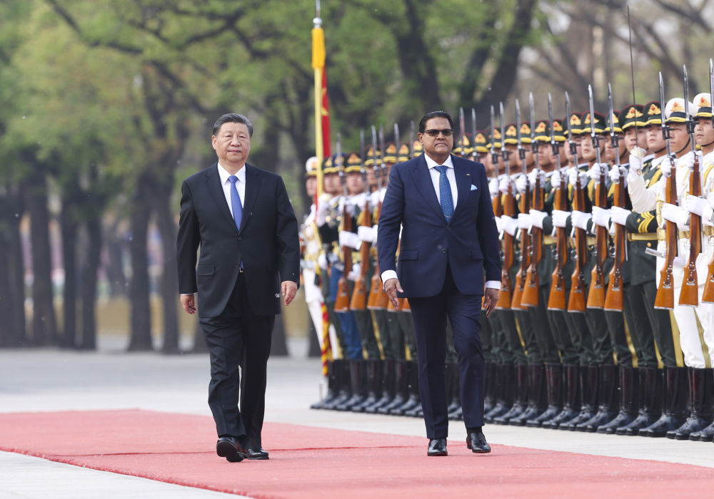 4月12日下午,国家主席习近平在北京人民大会堂同来华进行国事访问的苏里南总统单多吉举行会谈。这是会谈前,习近平在人民大会堂东门外广场为单多吉举行欢迎仪式。新华社记者 翟健岚 摄