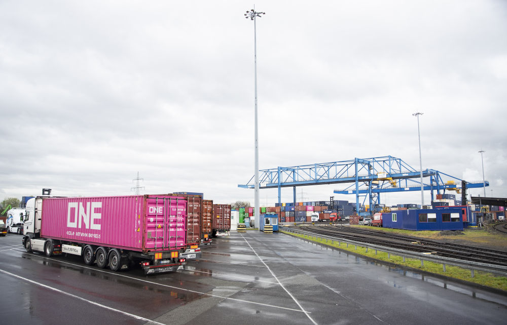这是3月28日在德国杜伊斯堡一处货运场站拍摄的集装箱。