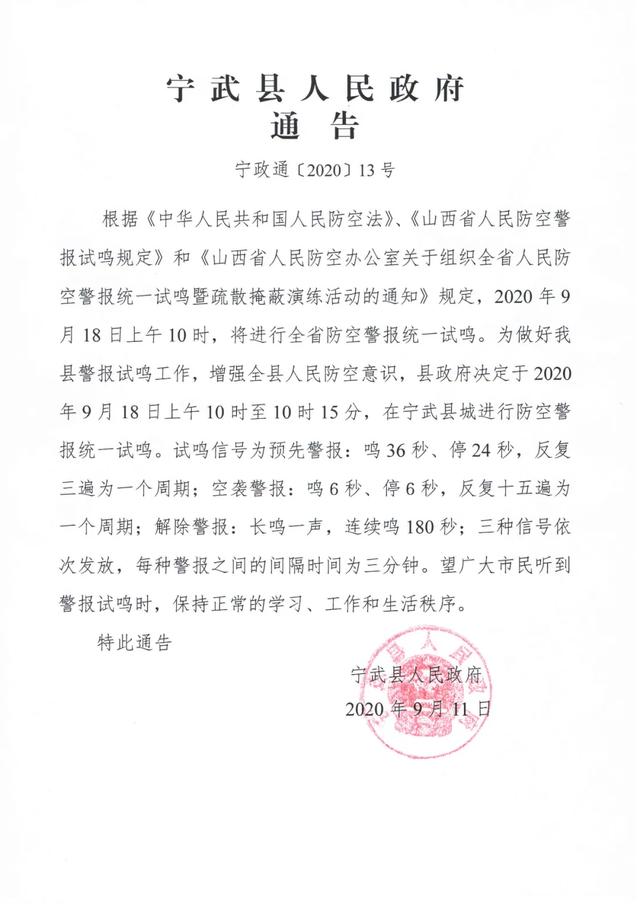 根据《中华人民共和国人民防空法》、《山西省人民防空警报试鸣规定》和《山西省人民防空办公室关于组织全省人民防空警报统一试鸣暨疏散掩蔽演练活动的通知》规定,2020年9月18日上午10时,将进行全省防空警报统一试鸣。为做好我县警报试鸣工作,增强全县人民防空意识,县政府决定于2020年9月18日上午10时至10时15分,在宁武县城进行防空警报统一试鸣。试鸣信号为预先警报:鸣36秒、停24秒,反复三遍为一个周期;空袭警报:鸣6秒、停6秒,反复十五遍为一个周期;解除警报:长鸣一声,连续鸣180秒;三种信号依次发放,每种警报之间的间隔时间为三分钟。望广大市民听到警报试鸣时,保持正常的学习、工作和生活秩序。