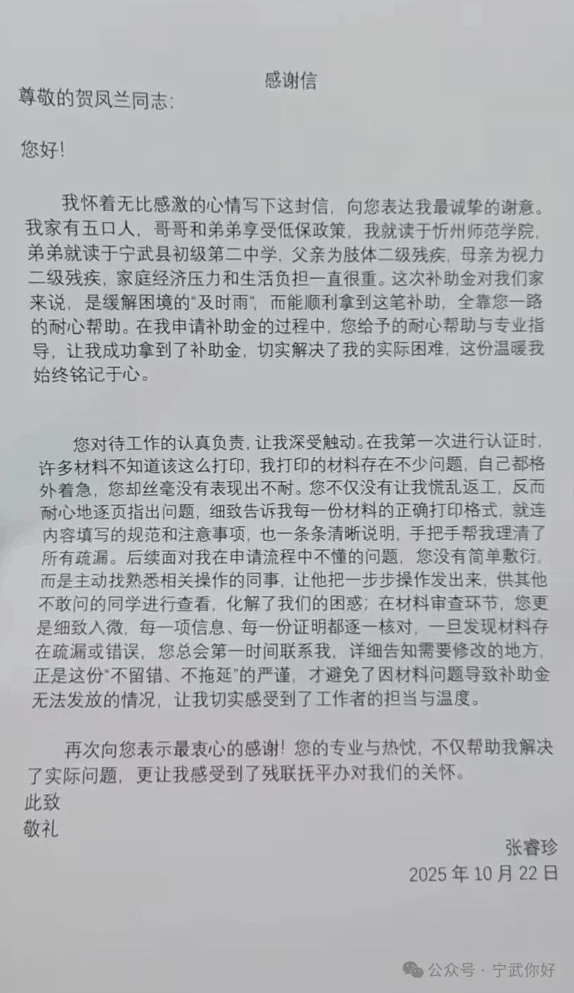 除了锦旗,还有感谢信。东寨镇东寨村残疾人张睿珍将一封感谢信送到了残联专职委员贺凤兰手中,信中提及在申请补助金过程中,贺凤兰给予了耐心帮助和专业指导,包括在材料打印、内容填写规范、申请流程操作等方面指出问题、说明注意事项,还在材料审查环节逐一核对信息,最终让张睿珍成功拿到补助金。字里行间满含的感恩之情,成为基层助残工作最动人的注脚。