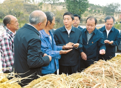 十月九日,省委书记骆惠宁来到偏关县柏林峁村小广场,察看刚收获的谷穗长势,向村民介绍秋膜保墒好处。本报记者 李联军摄