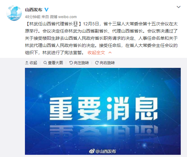 中国网12月5日讯 据山西省人民政府新闻办公室官方微博消息,12月5日,山西省十三届人大常委会第十五次会议在太原举行。会议决定任命林武为山西省副省长、代理山西省省长。