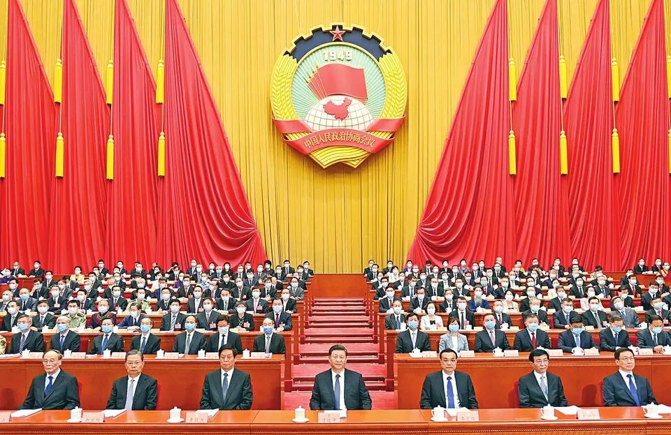 人民大会堂万人大礼堂内灯光璀璨,气氛庄重。悬挂在主席台正中的中国人民政治协商会议会徽熠熠生辉,十面鲜艳的红旗分列两侧。