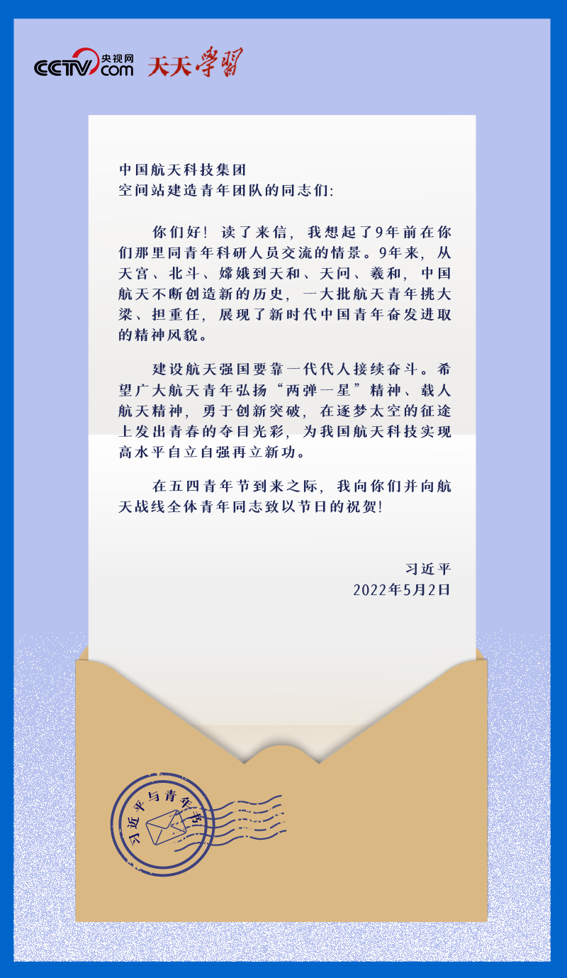 2022年5月2日,在五四青年节到来之际,中国航天科技集团空间站建造青年团队收到了一份特别的节日礼物——一封落款为“习近平”的回信。