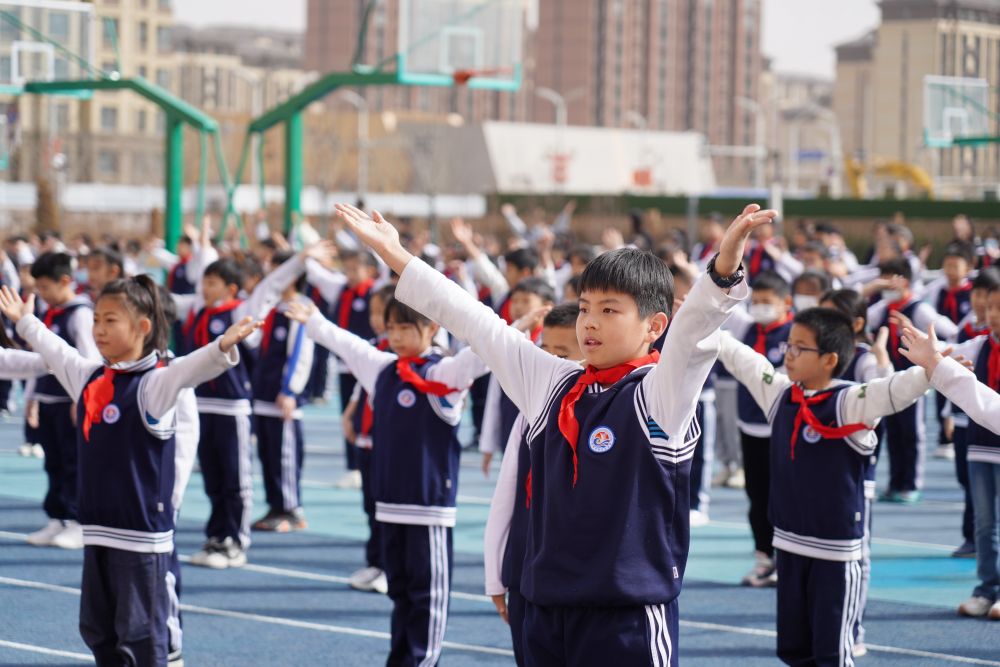 雄安新区容西片区云溪小学的学生在操场上做操(2023年3月23日摄)。新华社记者 牟宇 摄