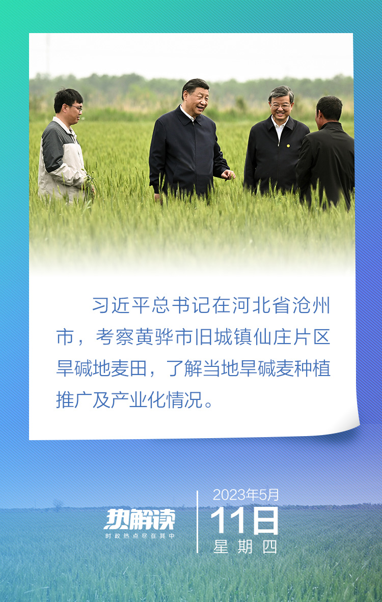 5月11日,习近平总书记来到河北省沧州市考察调研。总书记沿着田埂走进旱碱地麦田,向农民和农技人员现场了解当地旱碱麦种植推广等情况,再次彰显了对粮食安全这一“国之大者”的关注。