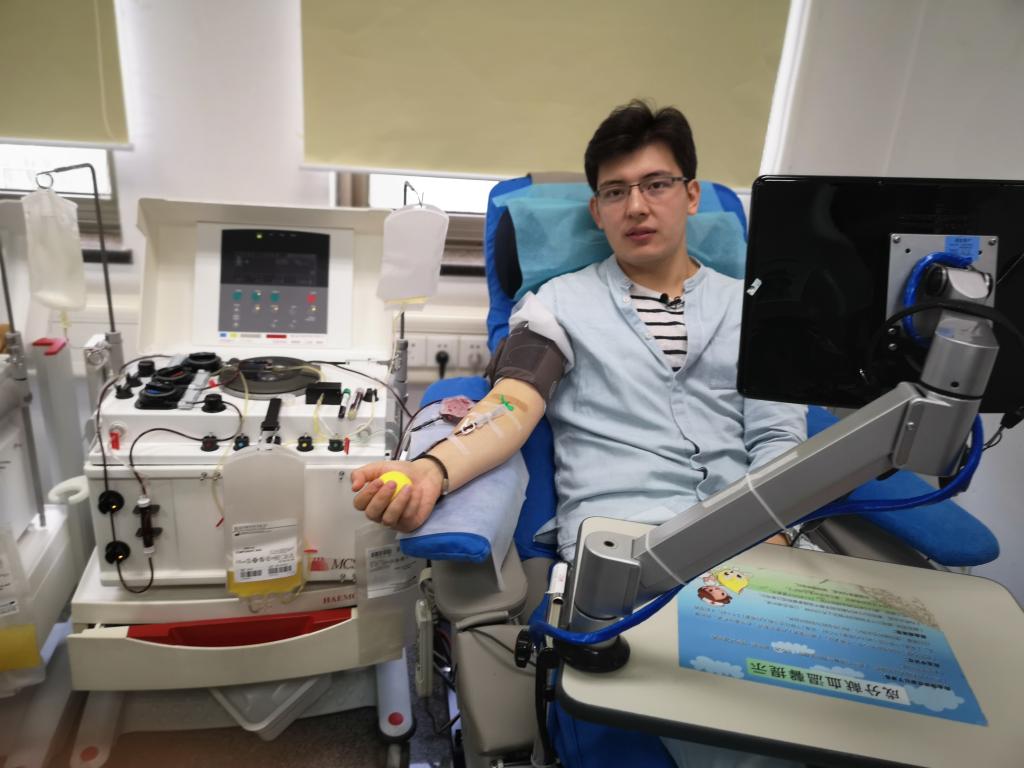 鲁斯兰在北京市红十字血液研究所献血(2018年5月22日摄)。新华社发