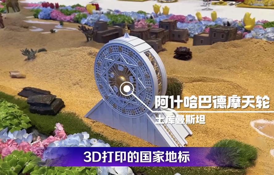 在半开放式集体国宴的餐台上,有一组按比例精确3D打印的中国和中亚国家地标。