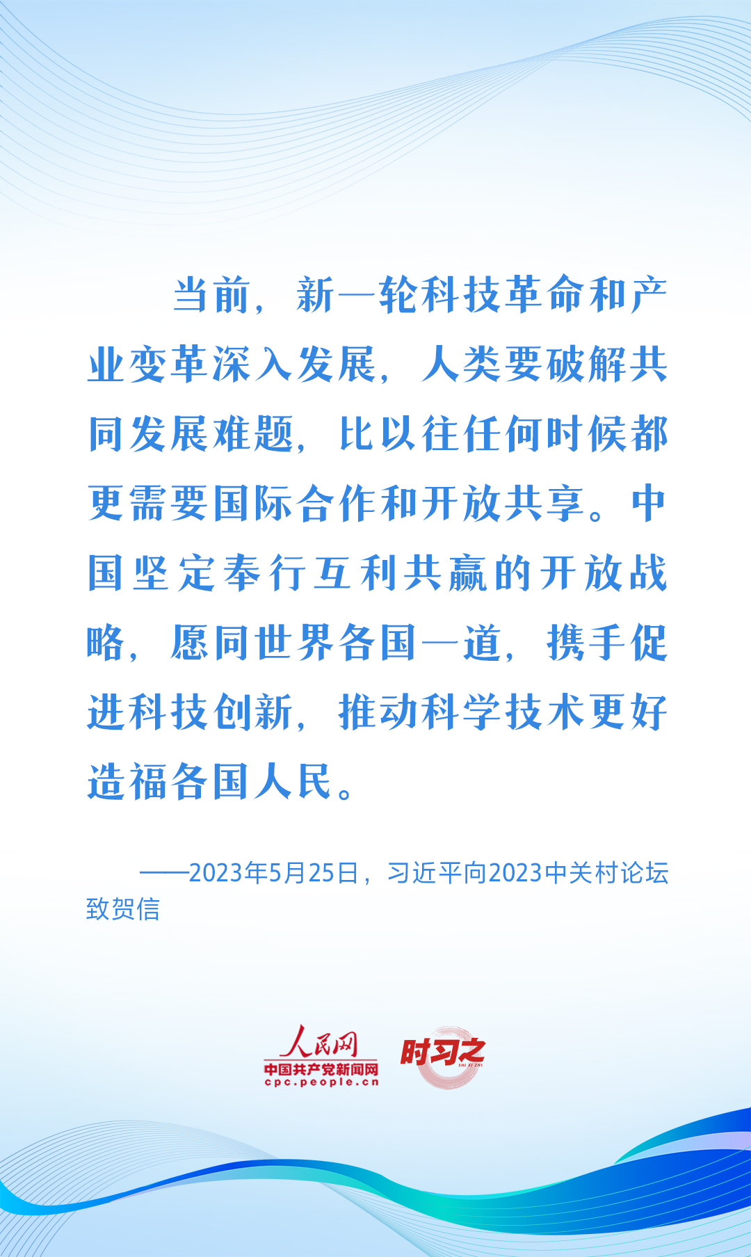 2023年5月25日,国家主席习近平向2023中关村论坛致贺信。习近平在贺信中指出,当前,新一轮科技革命和产业变革深入发展,人类要破解共同发展难题,比以往任何时候都更需要国际合作和开放共享。