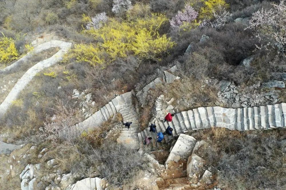 浓荫蔽日的青龙峡山间,4个汉子吃力地扛起一块巨石,踉踉跄跄抬到半山的土坡上。石堆远处,另外4个汉子正俯着身子铺路,大石拼路、小石填缝,“嗒嗒嗒”的锤声在山谷回荡。不规则的石块在他们手里拼出了一节1米多宽齐整的石阶,一点点向山上延伸……