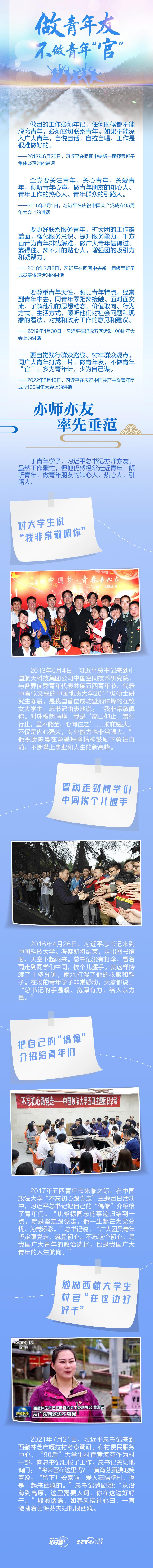 联播+ 当代中国青年是与新时代同向同行、共同前进的一代。对于青年成长和青年工作,习近平总书记一直很关心。他曾明确指出,团干部要“做青年友,不做青年‘官’”。谆谆话语,发人深思。