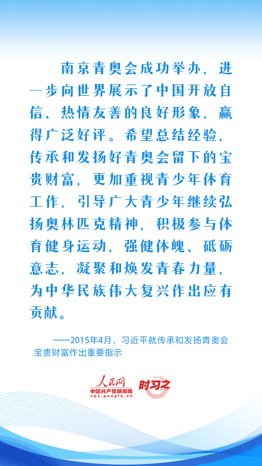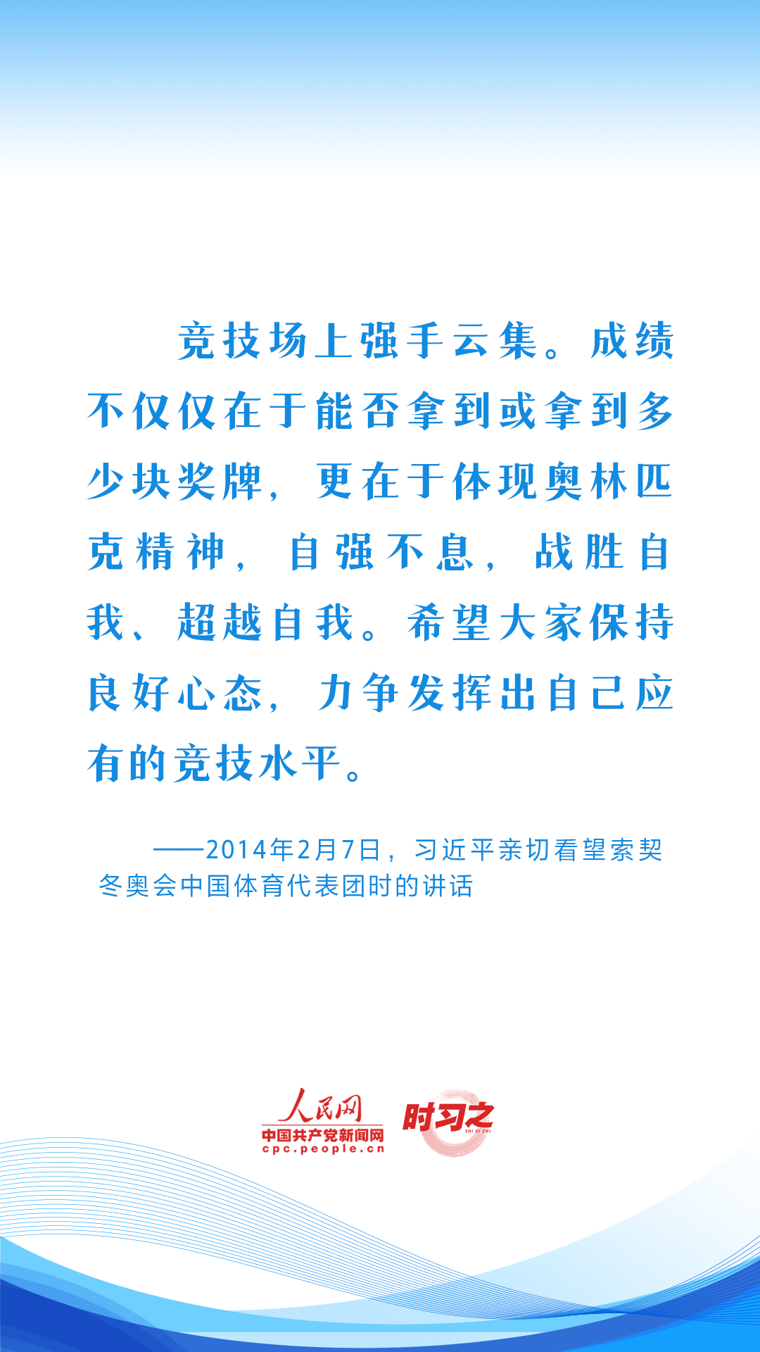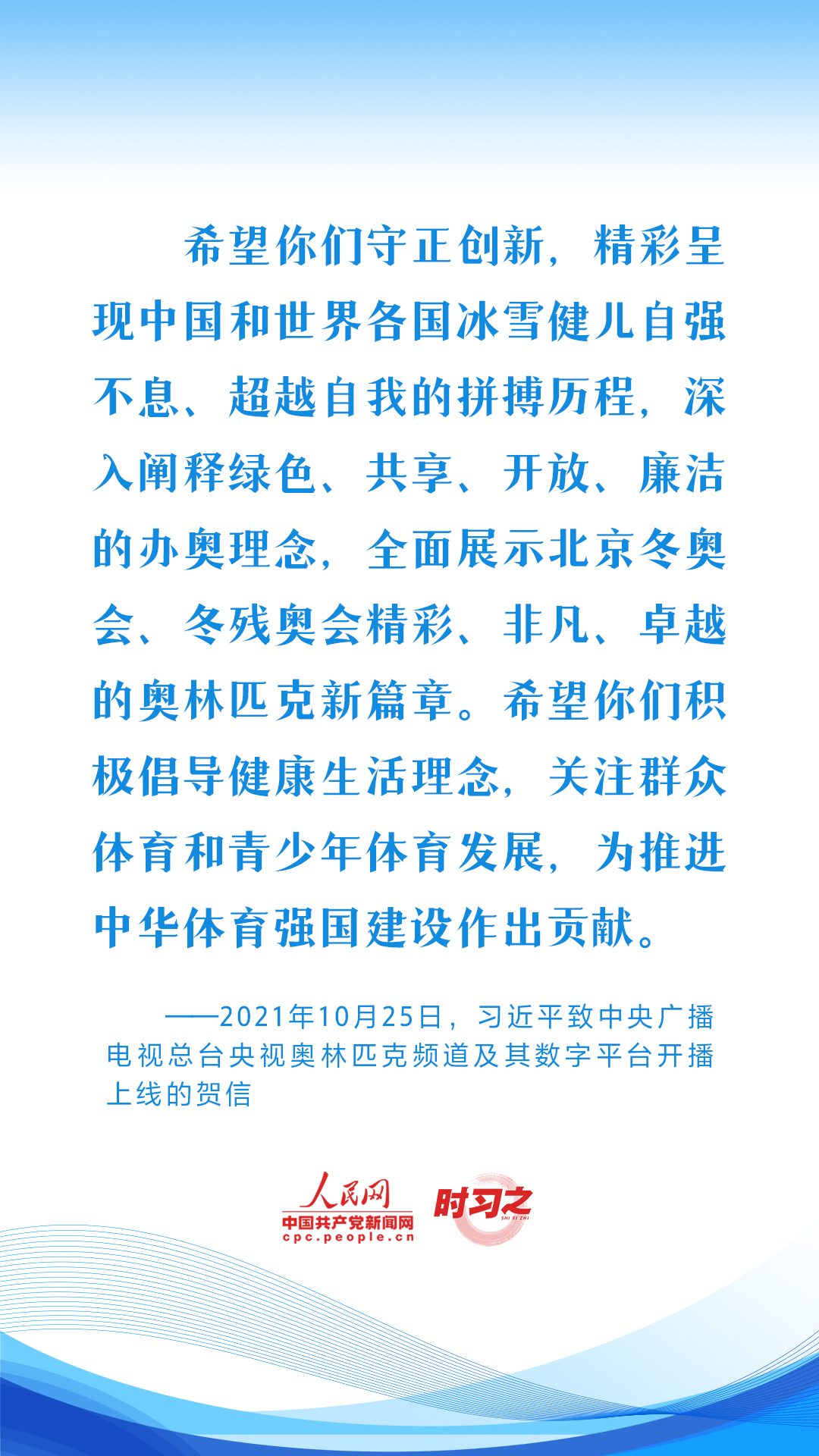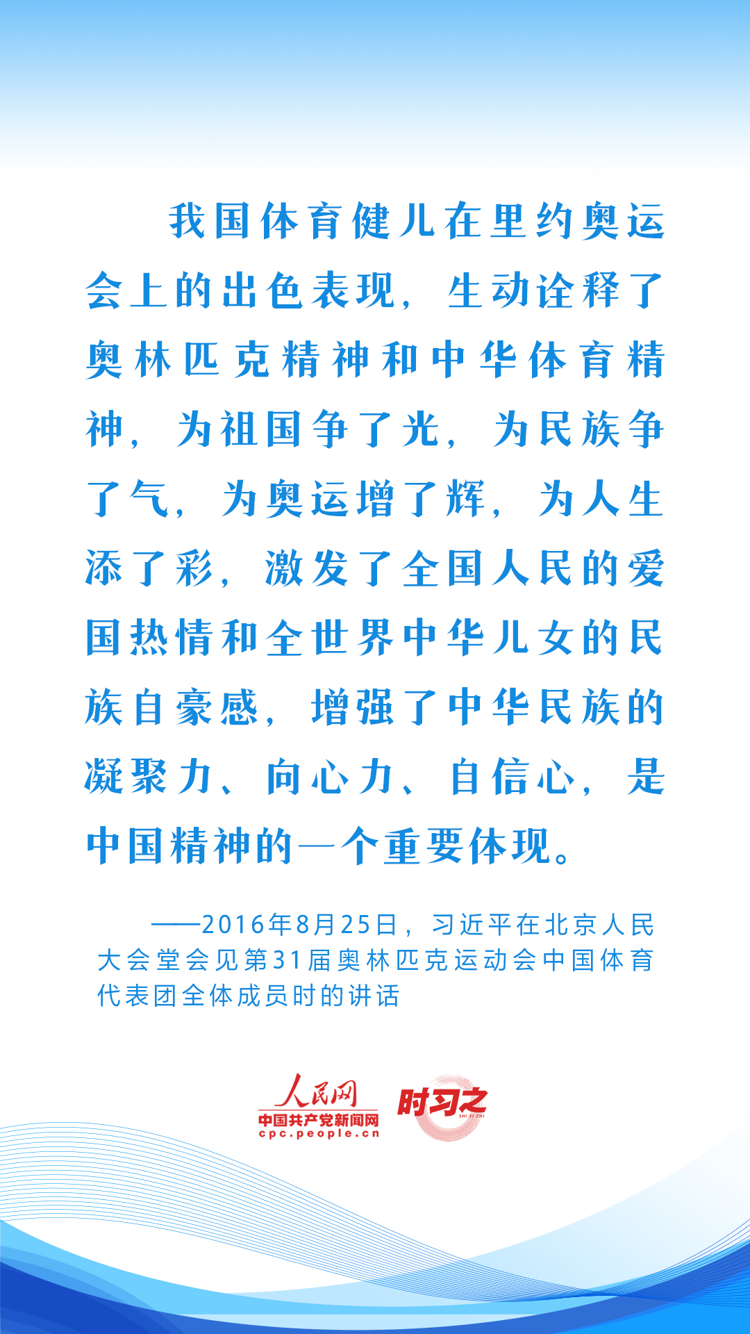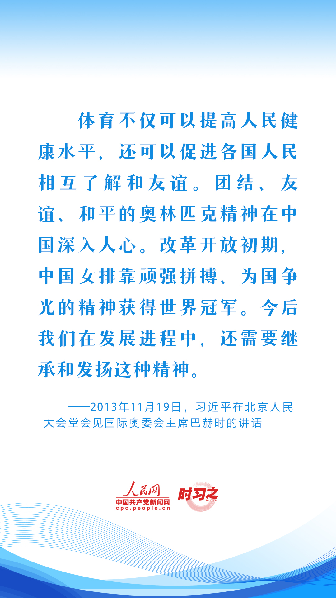 习近平始终心系体育事业发展,句句铿锵话语激励着广大体育工作者继续弘扬奥林匹克精神和中华体育精神,推动我国体育强国建设。