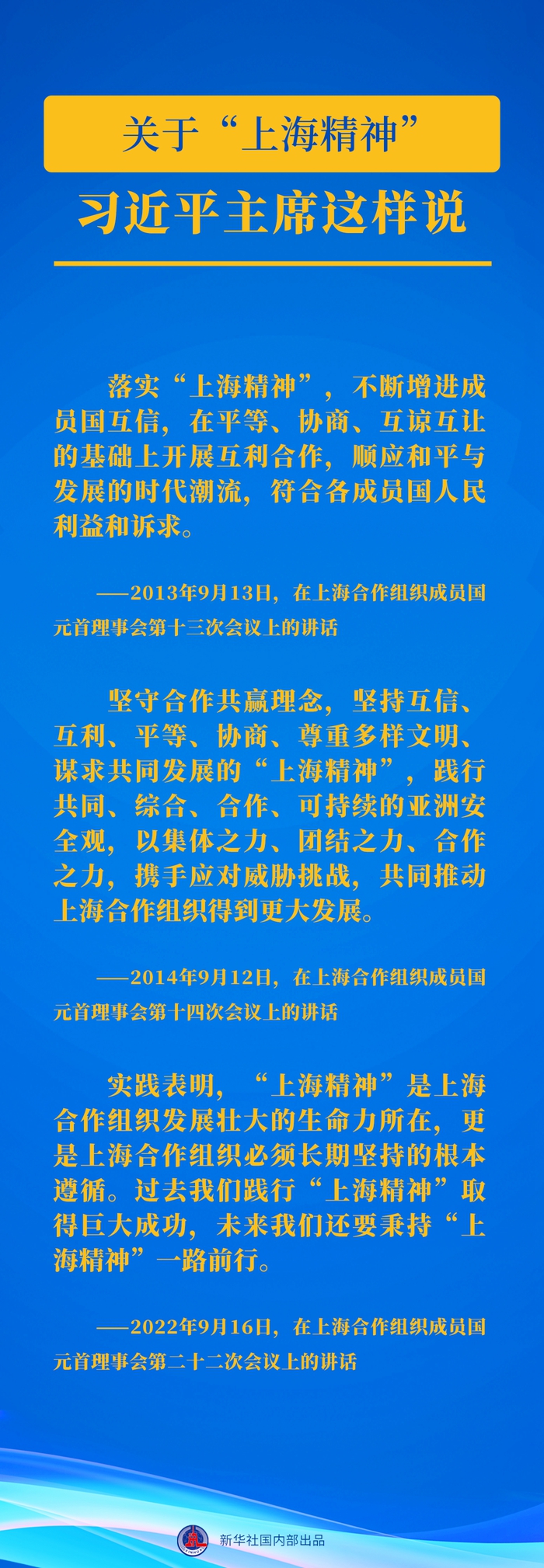 2001年6月,上合组织成员国国家元首签署了《“上海合作组织”成立宣言》,宣告上合组织正式成立。宣言明确了以“互信、互利、平等、协商、尊重多样文明、谋求共同发展”为基本内容的“上海精神”。