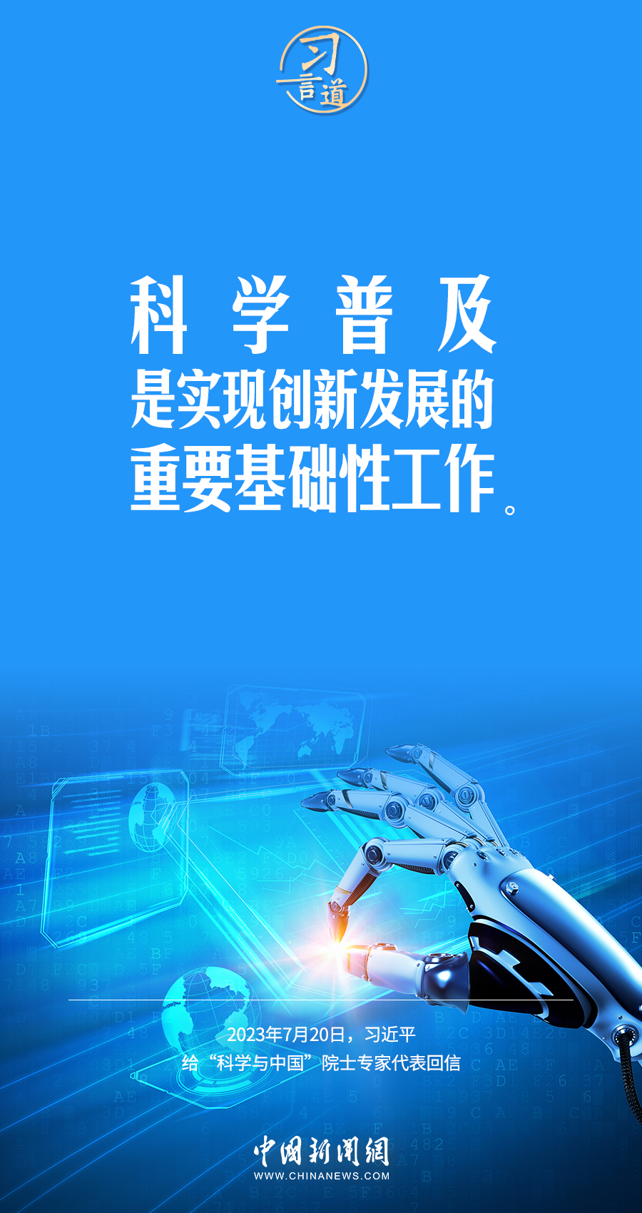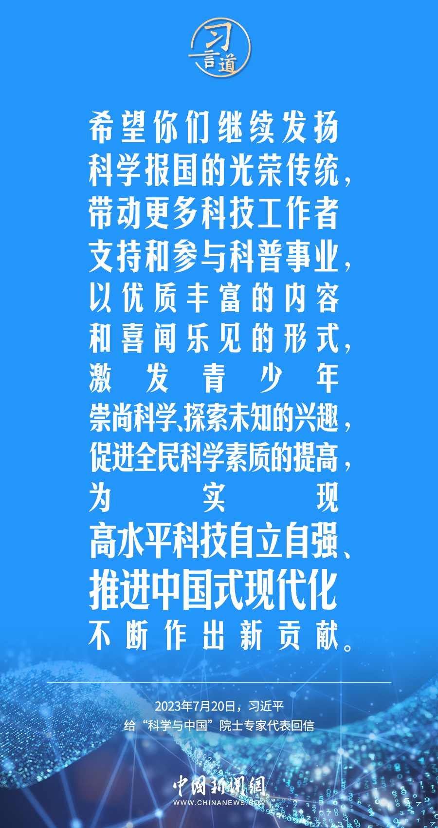 中共中央总书记、国家主席、中央军委主席习近平7月20日给“科学与中国”院士专家代表回信,对科技工作者支持和参与科普事业提出殷切期望。他指出——