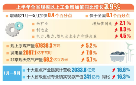 本报讯(记者晋帅妮)省统计局日前发布上半年全省经济运行情况,我省工业保持平稳增长。上半年,全省规模以上工业增加值同比增长3.9%,增速较1月—5月加快0.4个百分点,快于全国0.1个百分点。全省采矿业增加值同比增长2.1%,制造业增长8.3%,电力、热力、燃气及水生产和供应业增长4.5%。